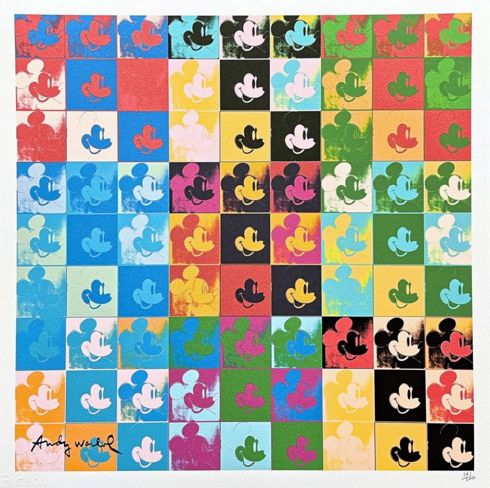 - Andy Warhol - Mickey Mouse barevná koláž 361/500 - signováno, 50x50cm, limitovaná edice CMOA s certifikátem